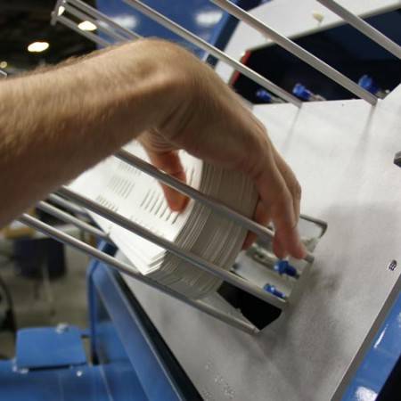 - Blisters and cards feed automatically into nesting trays. Feed stations are reloadable during machine operation
