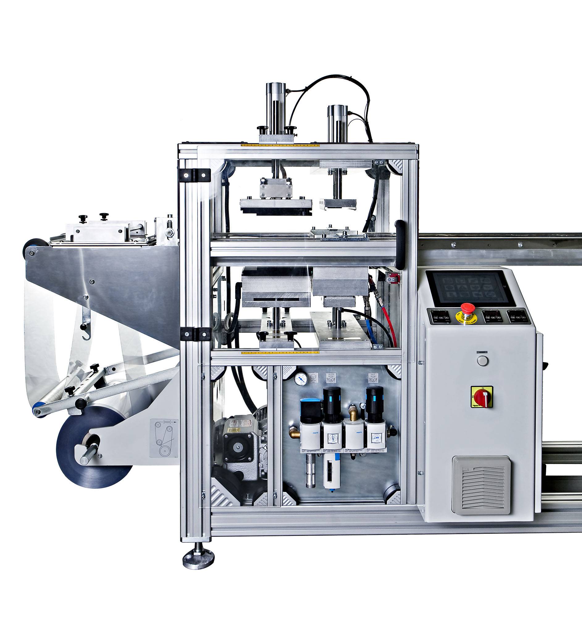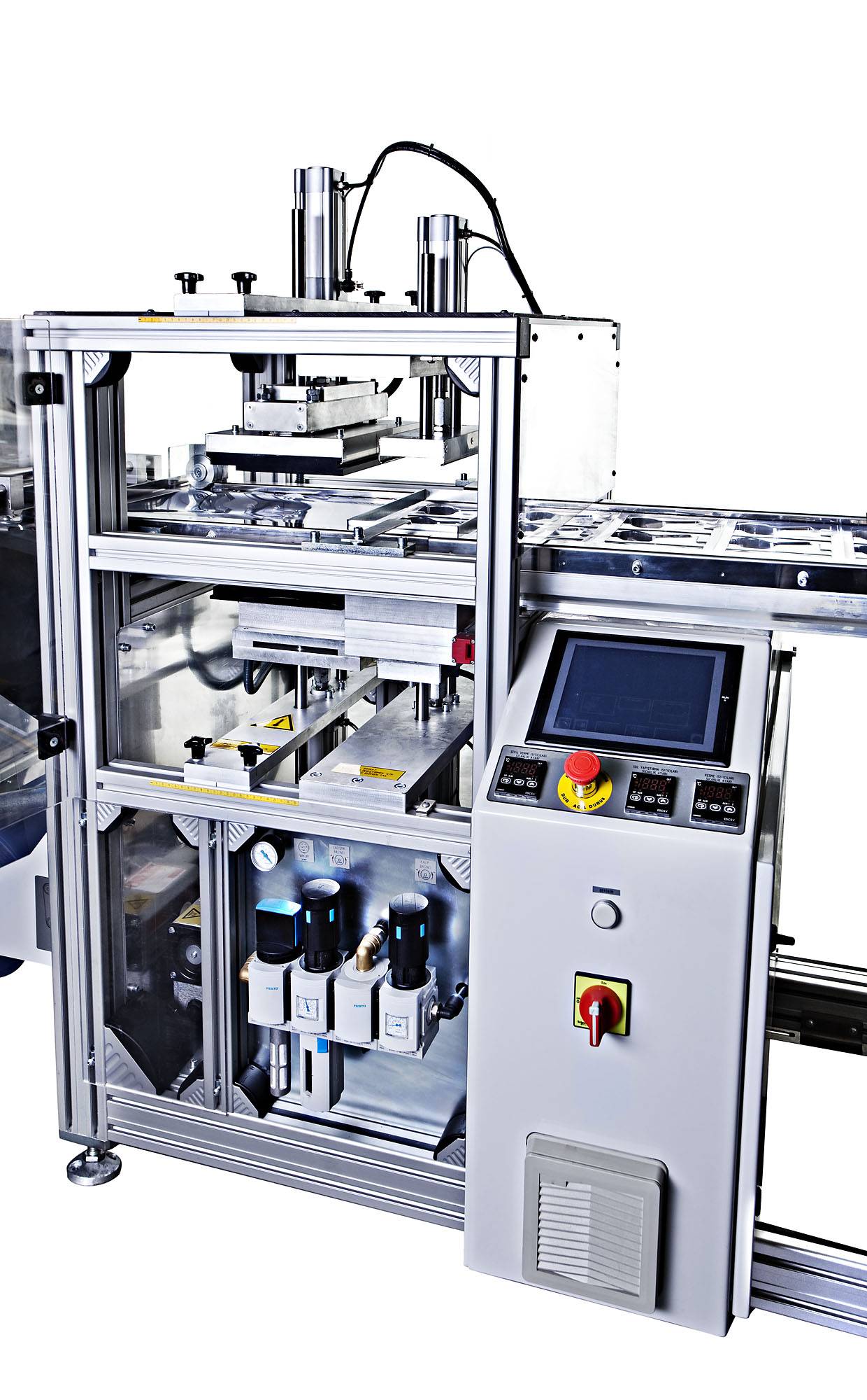Plastic film is fed from a roll into a set of indexing chains that pierce the film and move it through a contact heater for heating to forming temperature. The heated sheet then indexes into a forming station where parts are formed by vacuum. The loading area allows the manual feeding of the products and the paper insert (if needed). Once products are already placed inside the formed blisters, the sheet moves into a sealing station where the complete working area is sealed against a plain film or a cardboard. Finally, the sheet moves into a die-press, mounted immediately after the sealing press, where individual blisters are punched out.