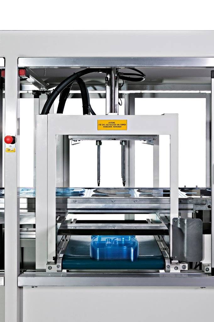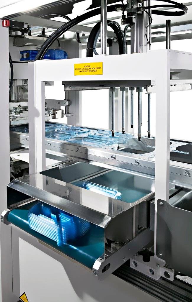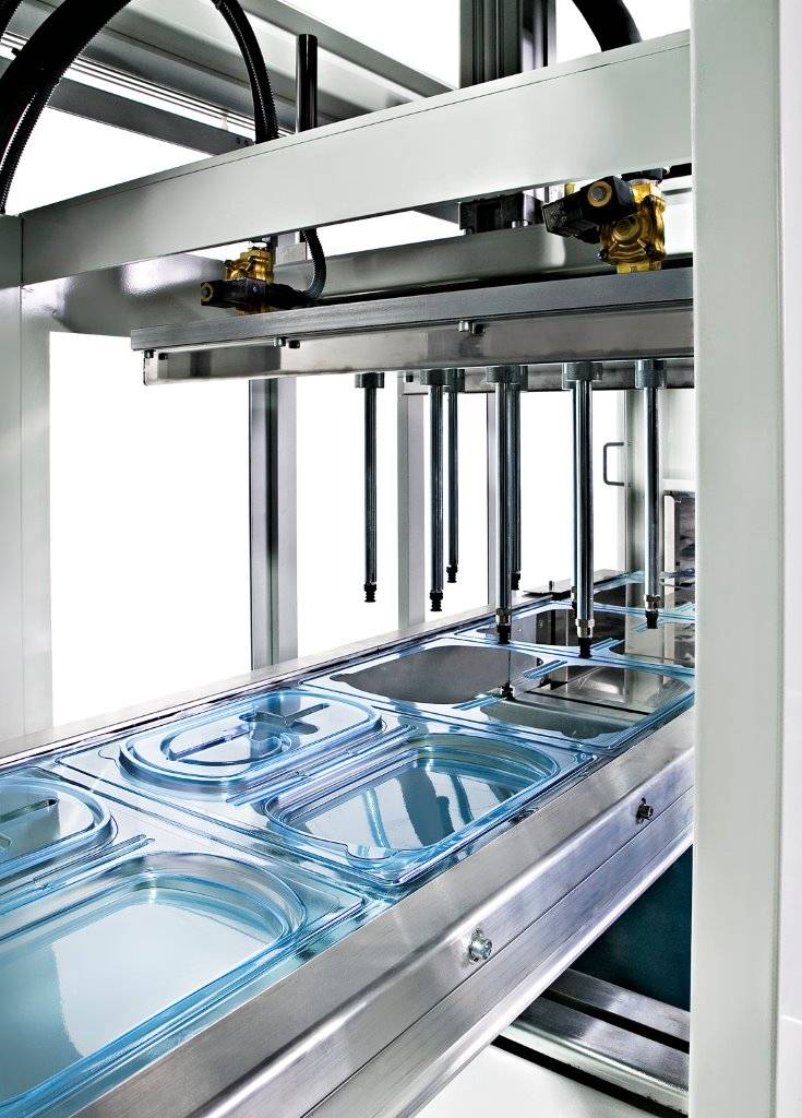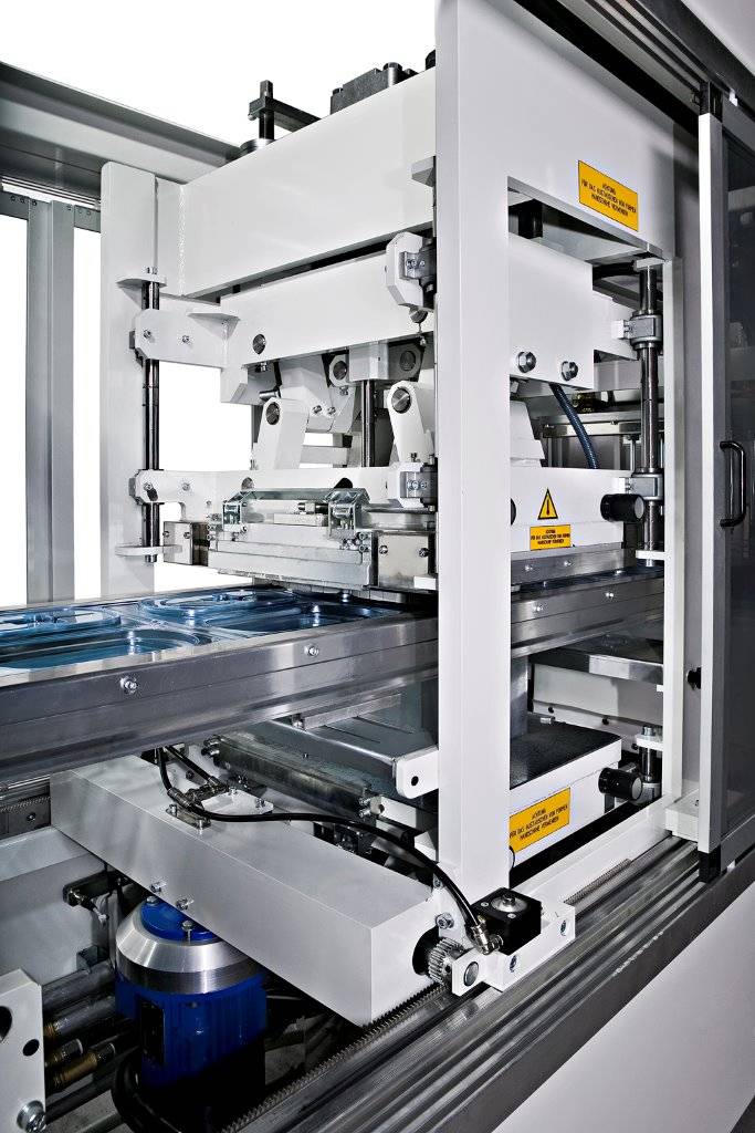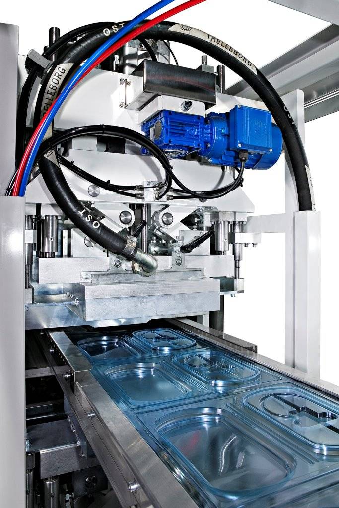 The TVP35 is a roll-fed automatic thermoforming machine with separate forming and trimming stations. The forming is made with a combination of vacuum and air pressure (up to 6 bars). Maximum forming area is 500x350 mm. This machine is suitable for the production of large outputs of small parts, with most of the thermoformable material (PVC, PET, PS, OPS,RPET)